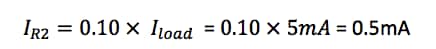 Let’s talk a moment about how to decide the resistor values you will need for your voltage divider.  To do so, you must take into account the load that will be connected to the output of the voltage divider.  Let’s assume our load is 1KΩ and requires 5V at 5mA.  We now apply the “10% Rule” so that the “bleeder current” through R2 is 10% of the current that we want to follow though the load.  In this case: