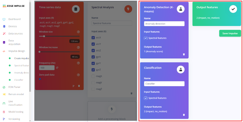In the next part of the Edge Impulse blog series, we will discuss how to use the Edge Impulse training pipeline to analyze spectral components of the raw data and generate features, anomaly detection, and classifiers.