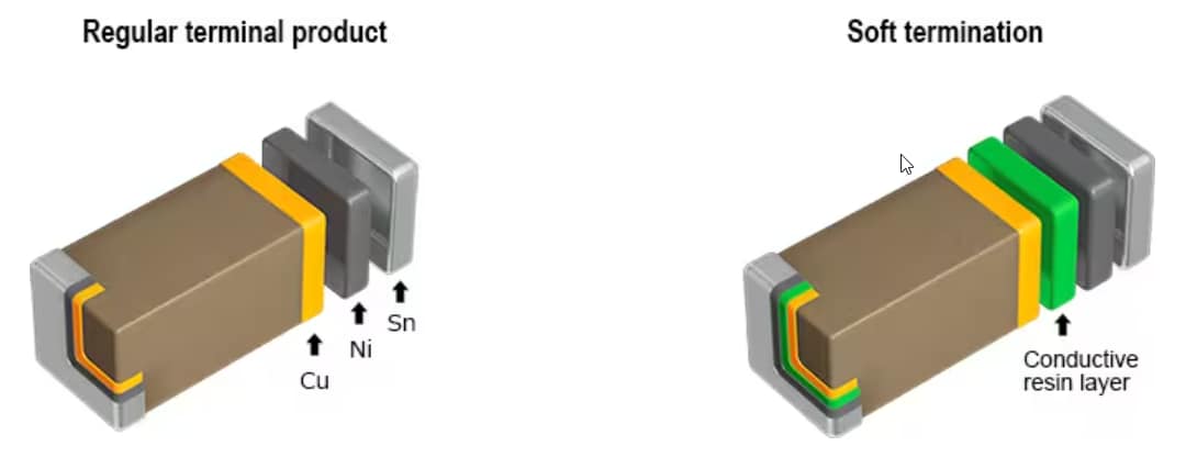 The terminal electrode of a conventional MLCC has the lower copper (Cu) layer electroplated with nickel (Ni) and tin (Sn). A conductive resin layer between the Cu and Ni layers creates a flexible connection (soft termination). This resin layer reduces the stresses caused by expansion or contraction of the solder joints due to temperature changes or bending stresses on the circuit board, causing cracks in the capacitor element.
