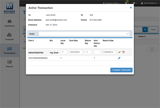 Sa modal overlay ng mga detalye ng transaksyon, makakagawa ka ng ilang pag-i-edit. Ang mga pag-i-edit na ito ay puwedeng maliit lang gaya ng pagdaragdag ng mga note ng transaksyon, o malaki gaya ng pag-a-update ng dami ng ii-issue o takdang petsa kung kailan ibabalik ang produkto. Puwede mo ring markahan na sardo na ang isang aktibong transaksyon sa pamamagitan ng pagtukoy sa anumang dami na ibinalik, petsa ng pagbabalik at pag-click sa button na "Kumpleto na ang Transaksyon".